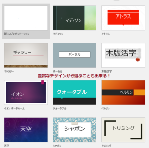 パワーポイントが起動すると、ファイルの新規作成画面に移行します。「新しいプレゼンテーション」から何も設定されていないファイルを作成することが出来ます。その他にもデザインテンプレートを選択し、予めテーマに沿ったデザイン設定がされているファイルを作成することも出来ます。
