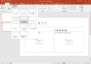 1枚のスライドを作成したら、次のスライドを追加してみましょう。画面上部の「新しいスライド」を選択してスライドを追加します。そのスライドの内容をどんな構成にしたいかによって、予めスライド内のレイアウトパターンも選択できるので活用すると良いでしょう。