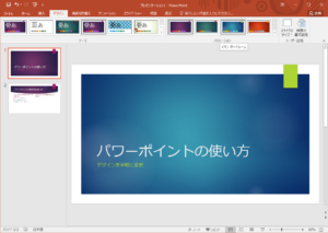 初めからテンプレートを使用していなくても、後からプレゼンテーションのデザインを変えることが出来ます。雰囲気が変わるので、テーマに合ったものを選んでみましょう。設定は画面上部の「デザイン」から。