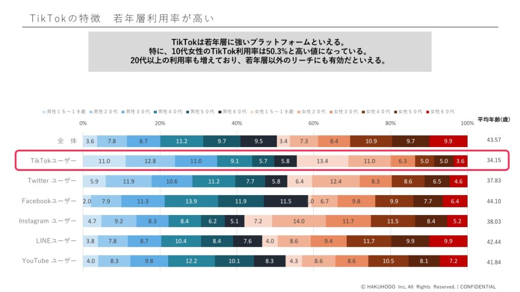 TikTokは主に10代から20代までの利用者が最も多く、10代女性の二人に一人がTikTokを使っているというデータもあります。これはその他のLINEやInstagramなどと比べても低く、若者に特化したコンテンツと言えるでしょう。しかし、ユーザー平均年齢は34歳と年々上昇していっています。このことから30~40代のユーザーも年々増加傾向にあることが分かっています。