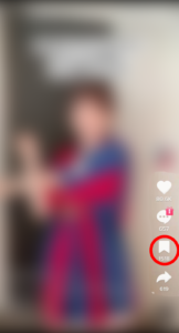 TikTokの動画の右下には4つのアイコンがあります。保存したい動画を開いて、赤マルで囲われたアイコン(シェアボタン)を押してください。