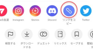 シェアボタンを押すまではTikTokを用いて保存する方法と変わりません。シェアボタンを押し、赤マルで囲われている「リンクをコピー」を押し、リンクをコピーしましょう。