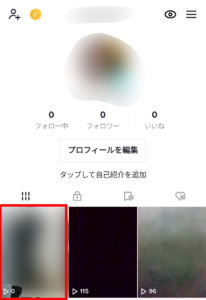 自分の投稿した動画は、赤い四角で囲われた動画のように自分のプロフィールから確認することが可能です。動画の視聴回数も画面に反映されます。これで撮影から投稿までの一連の流れが完了しました。